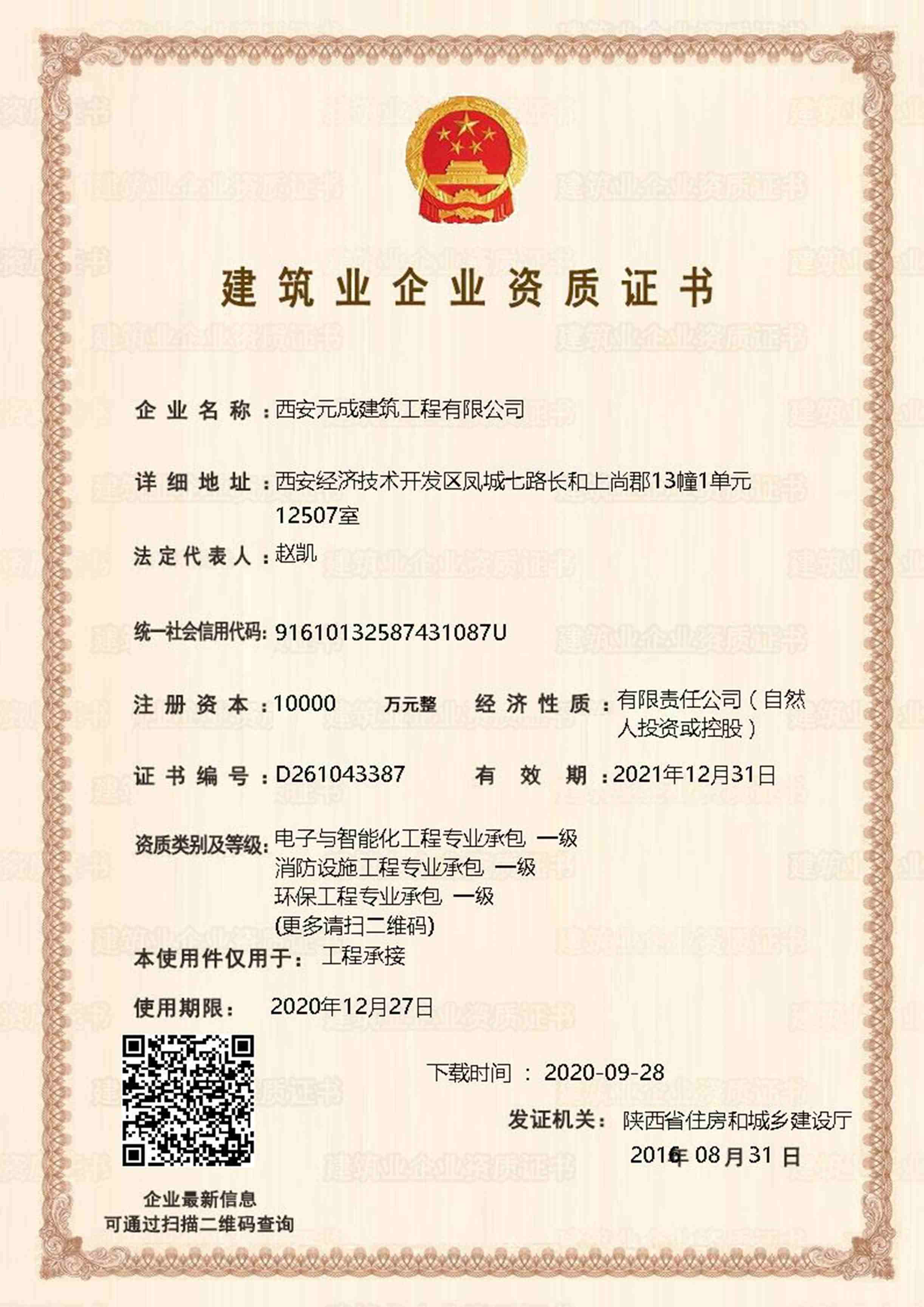 西安元成建筑工程有限公司成立于2012年,是一家擁有建筑工程、市政公用工程、石油化工工程、機電工程施工總承包貳級;鋼結構工程、防水防腐保溫工程專業承包貳級;電力工程、水利水電工程施工總承包叁級;建筑機電安裝工程、輸變電工程、環保工程專業承包三級;模板腳手架專業承包、勞務分包等綜合性施工企業。